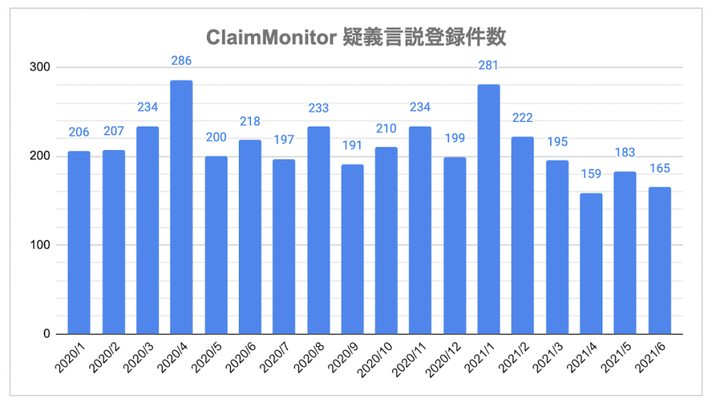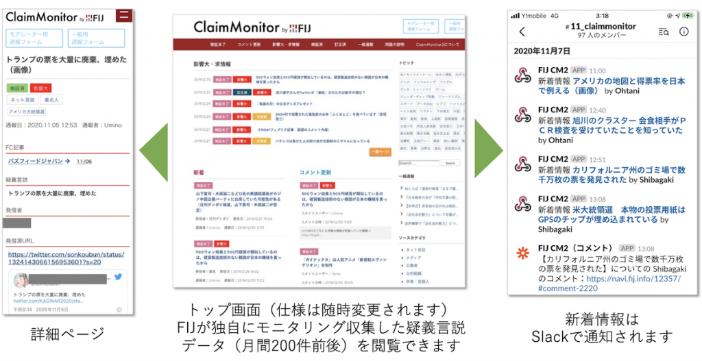 - ● 「疑義言説」とは、社会一般に公開・流通している事実言明のうち真実性・正確性に疑義があるものを指します。 FIJのスタッフがモニタリングして収集した疑義言説の情報は、ClaimMonitorに登録・掲載されます。新着情報の通知をメッセージアプリ「Slack」で受け取ることもできます。