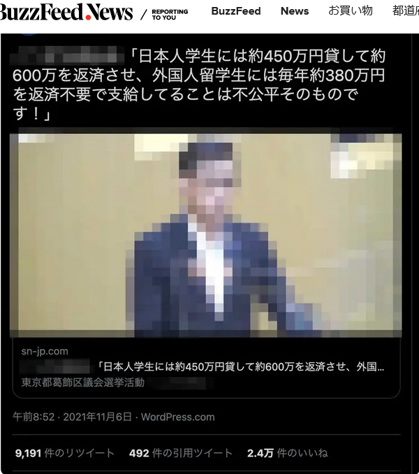 ファクトチェック対象 外国人留学生に毎年380万円を返済不要で支給2021.11.3 Twitter投稿ファクトチェック結果文科省の2021年度予算案では単純計算した1人当たりの平均金額は162万円で、「380万円」の半額程度にとどまる。「外国人留学生に毎年380万円を返済不要で支給」は誤り。「5千億円使われている」と拡散、16年前からネットに【BuzzFeed Japan】(2021.12.3) BuzzFeed Japan#「誤り」#BuzzFeed Japan#ClaimMonitor覚知#画像・動画情報を提供する活動を支援する