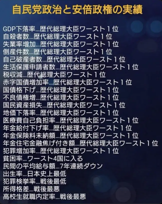 ファクトチェック対象 自民党政治と安倍政権の実績とする様々な分野の歴代ワーストなどをまとめた画像2022.7.31 Twitter投稿(画像)ファクトチェック結果これは虚偽情報だ。過去の小泉政権や鳩山政権などでも繰り返し拡散してきた「コピペ」で、正しい情報ではない。注意が必要だ。「安倍元首相は何を残したか」“歴代ワースト”と虚偽画像が拡散。「自民党政治と安倍政権の実績」は15年前のコピペ【Buzzfeed Japan】(2022.8.1) BuzzFeed Japan#「虚偽」#BuzzFeed Japan#ClaimMonitor覚知#安倍元首相銃撃事件・国葬#画像・動画#自民党情報を提供する活動を支援する