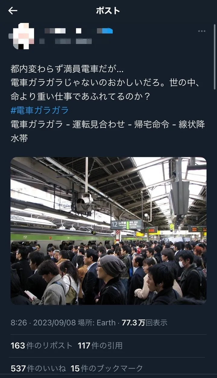 ファクトチェック対象 (台風なのに)都内変わらず満員電車2023.9.8 X(旧Twitter)投稿ファクトチェック結果8日朝の光景のように投稿されているが、これは8日に撮影されたものではない。「台風なのに満員電車」山手線ホームが混雑する画像→誤り。災害時、根拠不明な情報に要注意【ハフポスト 日本版】(2023.9.8) 朝日新聞#「誤り」#ハフポスト日本版#台風#災害#画像・動画情報を提供する活動を支援する