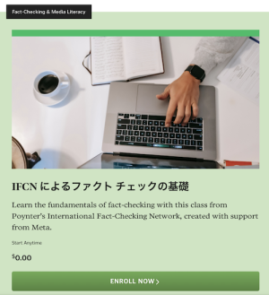 - IFCN(国際ファクトチェックネットワーク)が作成したファクトチェックのオンライン入門講座の日本語版(無料)です。ファクトチェックの歴史や基本的な方法論などについて学べます(IFCN制作、Meta支援、2023年公開)。